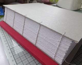 I've made myself a book - errr why? Don't I own a zillion sketchbooks already - but of course I do. However I have a particular project in mind for this. Yet again I've made a fat book - this time its not long, but has a deep spine. 5cm and thick paper 250 gsm. I attached each individual page, so teeny stitches, but pleased with my straight lines.